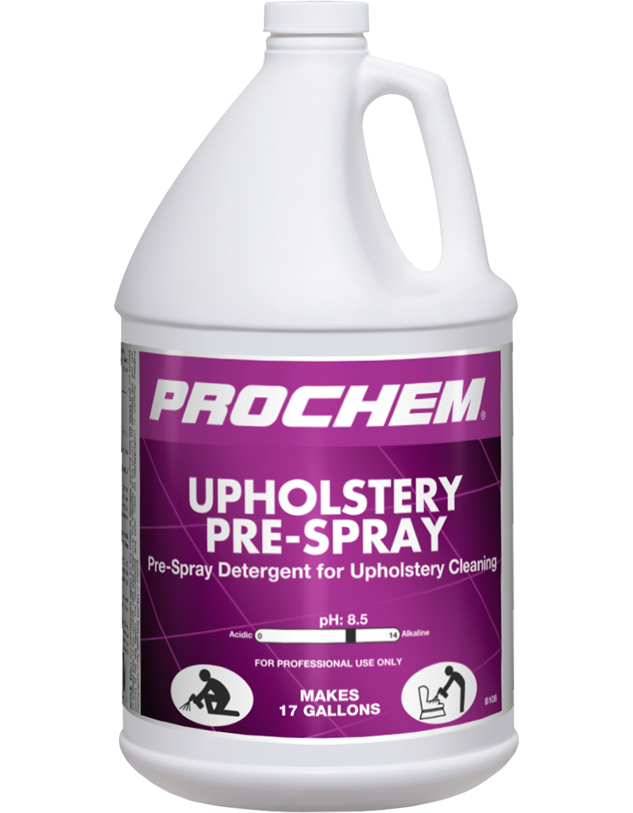 Prochem's Upholstery Pre-Spray is comprised of concentrated high-grade detergents, builders and surfactants blended with emulsifying solvents designed to effectively remove body and hair oils, food-based greases and grimy soils! This upholstery pre-spray excels as the first step in the two-step hot water extraction cleaning process for synthetic upholstery fibers. Follow with All Fiber Deep Clean for upholstery cleaning that is powerful enough for commercial use!
